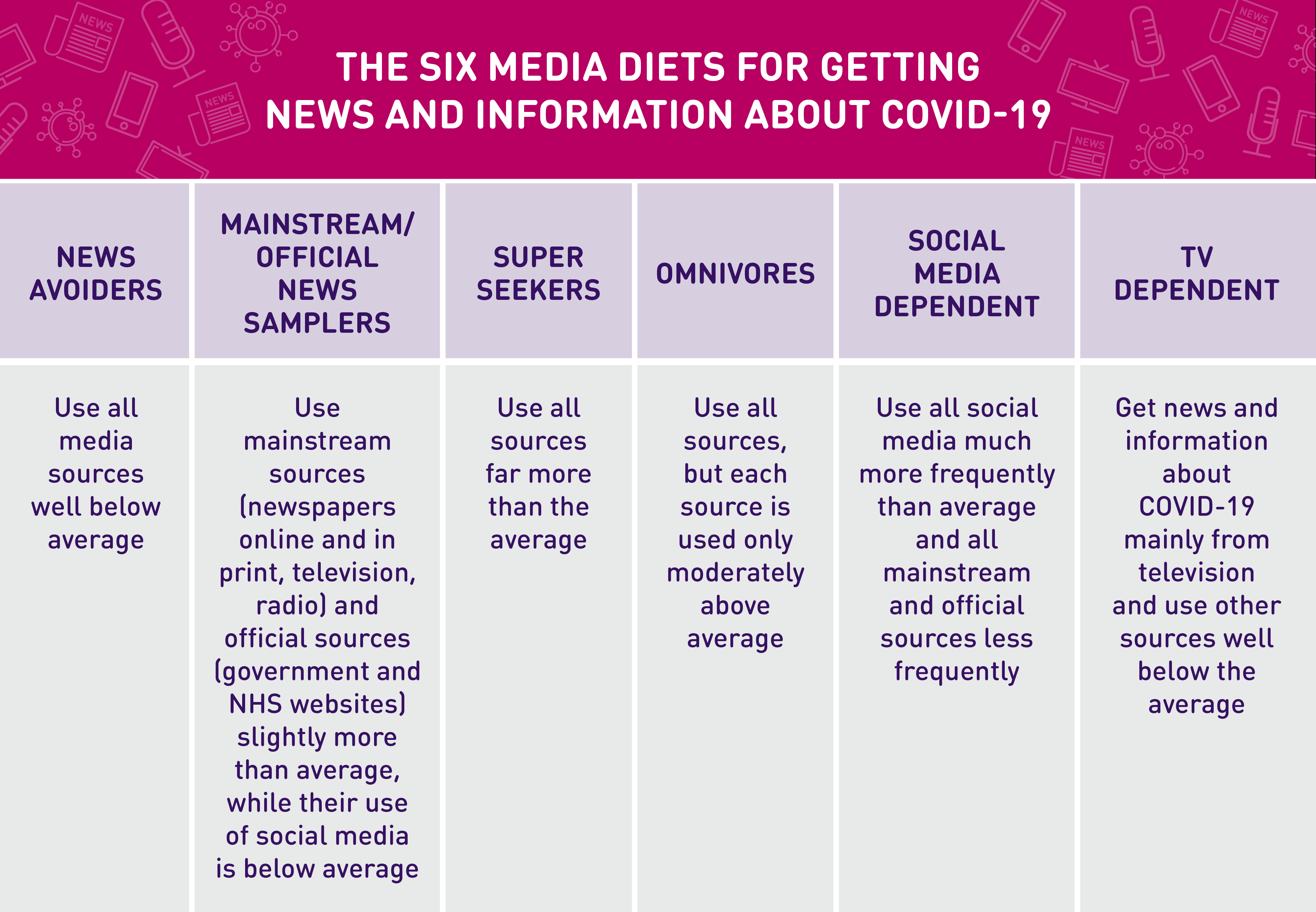 The project identifies six ‘media diets’ for getting news and information about COVID-19 among the UK public. They are: