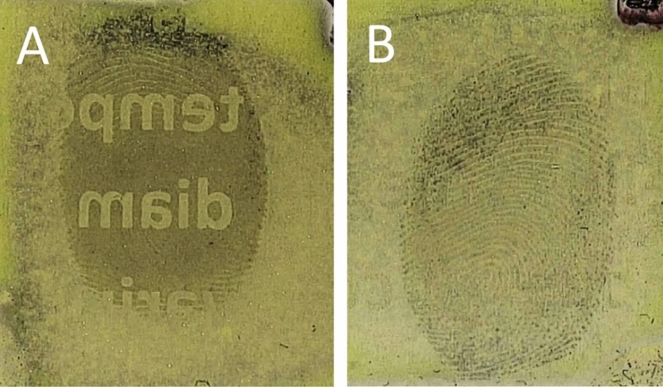 The process works by placing a thin layer of gelatine over any fingerprint that overlaps with printed text.