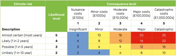 Image: Example of a scoring matrix used for rapid appraisal of climate risk likelihood and consequence expressed here in terms of cost (£) of damages/interruptions.