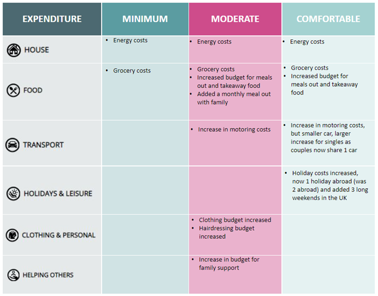 The latest research reflects the price rises that households have faced, particularly in food and energy use. It also highlights the increasing importance people place on spending time with family and friends out of the home, as people’s priorities have changed following the pandemic. This switch, and the associated costs are reflected in the updated levels.