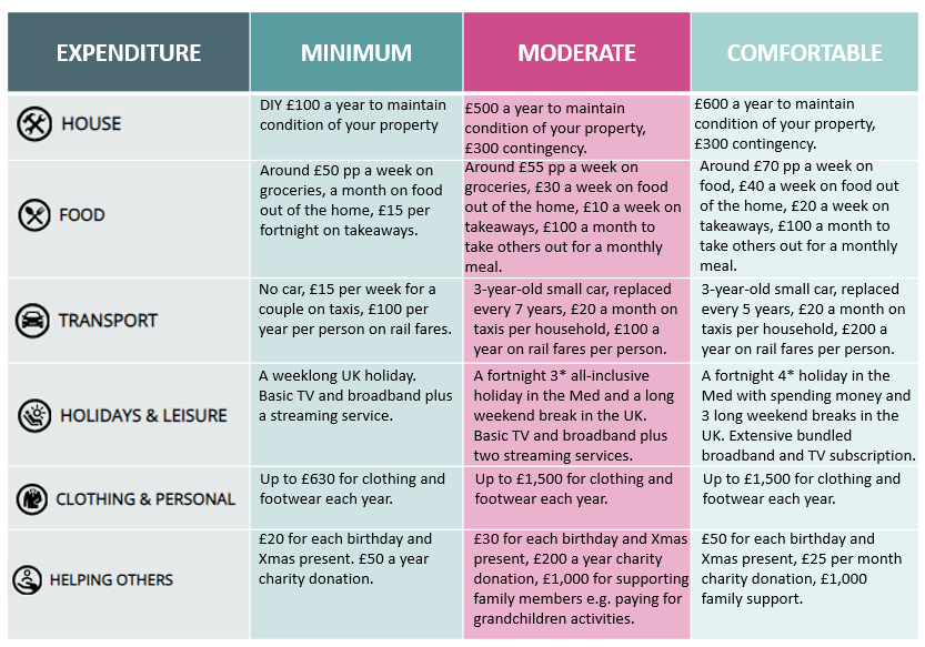 Not all savers are the same, they will have their own expectations and requirements when it comes to visualising their retirement. As financial planning tools, the RLS are designed to assist individuals in identifying elements of their preferred retirement lifestyle and provide insights into associated costs. The three levels show how people considered Minimum, Moderate and Comfortable living standards. Savers can use them to judge whether their current savings levels are going to enable them to reach their desired lifestyle which may fall between the given standards.