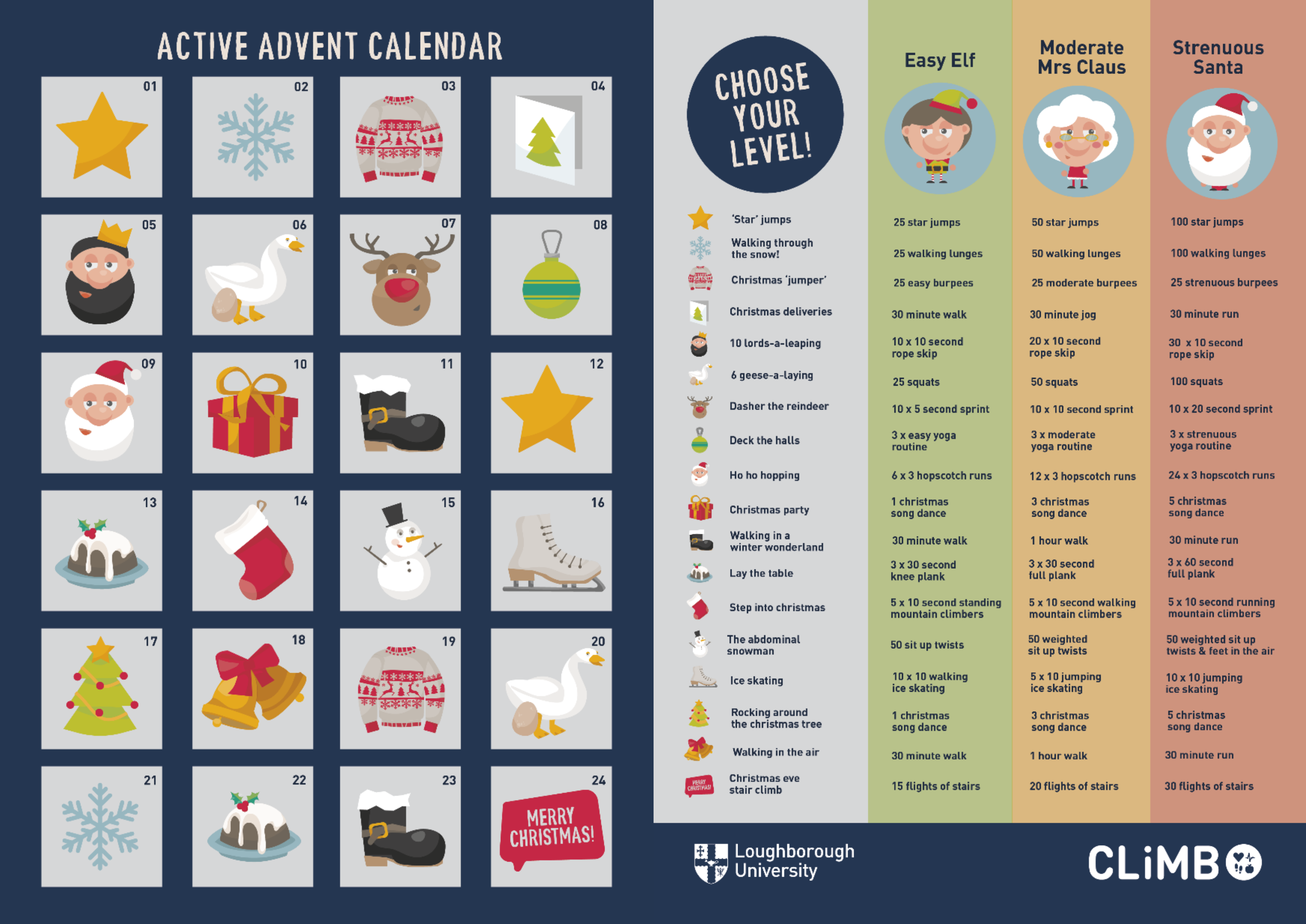 The ‘Active Advent’ intervention involved daily emails, replicating an Advent calendar, containing physical activity an idea. These came in three intensities: Easy Elf, Moderate Mrs Claus and Strenuous Santa. The comparator group received information about a healthy lifestyle on 1 December.
