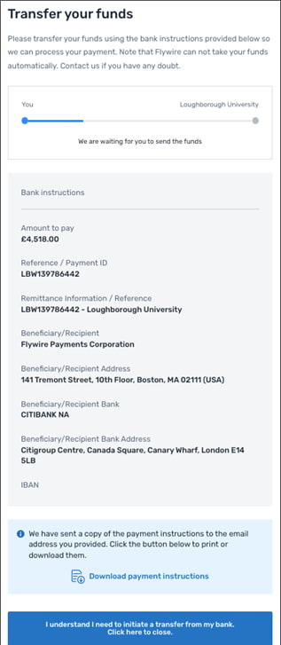 Once your funds reach Flywire, the payment is fully trackable, and you will be able to see when the funds are delivered to the University.