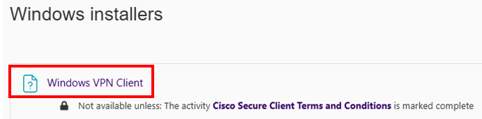 Once done, in the “Windows installers” section, click on Windows VPN Client as shown to download the installer file (you may need to scroll down slightly to find this).