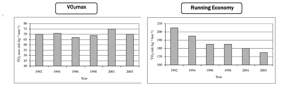 Below, are two graphs showing the VO2max and running economy of the former female marathon world record holder, Paula Radcliffe, over a period of 10 years.