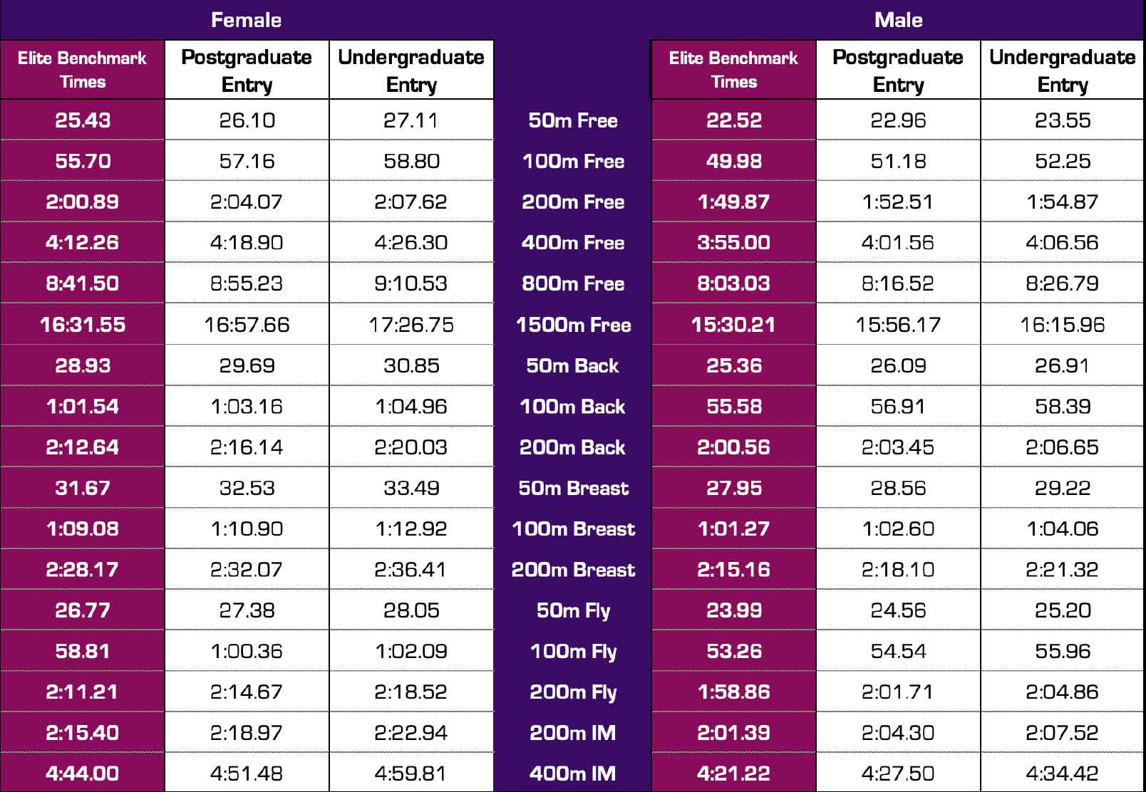 Athletes wishing to be considered should in the first instance speak with their squad coach and/or the Director of Swimming. In addition, they must have achieved an Elite Benchmark Time (Section 13).