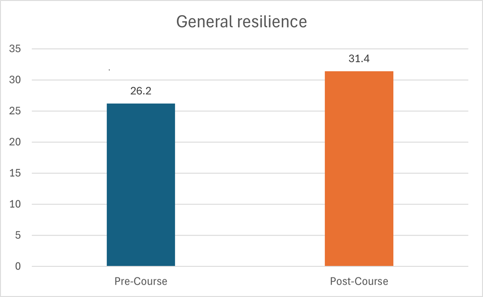 The students’ wellbeing, general resilience and resilience at university all increased following the courses: The following graphs illustrate the changes in students' overall average scores across the individual questionnaires.