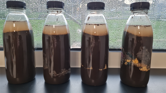 My research looks at trying to understand how small-scale soil microbial pathways respond to external pressures in order to ascertain how these largely invisible processes help support larger scale nutrient cycling and ecosystem function. The 4 unassuming plastic bottles here are a real-life experiment and are called Winogradsky columns. Here, I am using soil from just outside the Geography building to look at how native soil microbial communities recycle and process nutrients, necessary for survival. Each bottle has a different food source 1. Control (no food source), 2. Newspaper as a cellulose source, 3. Egg as a sulphur source and 4. Newspaper and egg combined. Over time (hopefully), we will see different colours emerge which will reflect different microbial communities which are living directly in the ground beneath our feet.